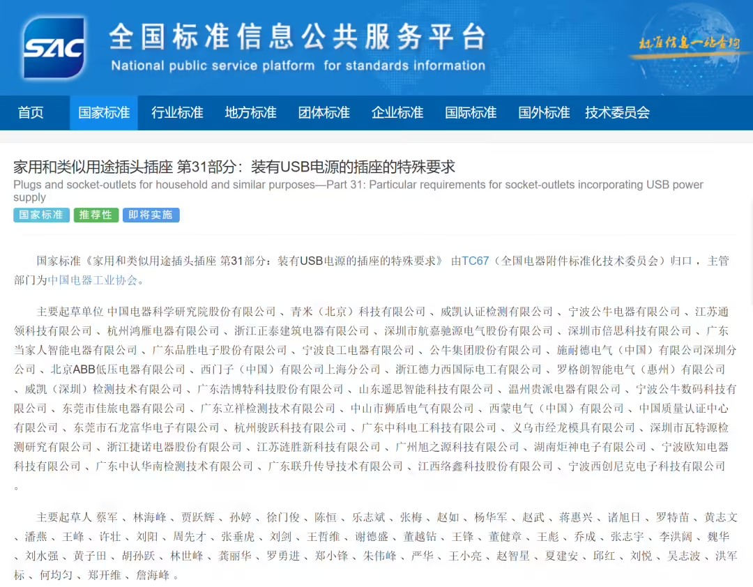 GB/T 2099.31-2025《家用和類似用途插頭插座 第 31 部分:裝有 USB 電源的插座的特殊要求》作為 GB / T 2099 標準新增內容,針對集成 USB 接口插座制定了專項技術規范。