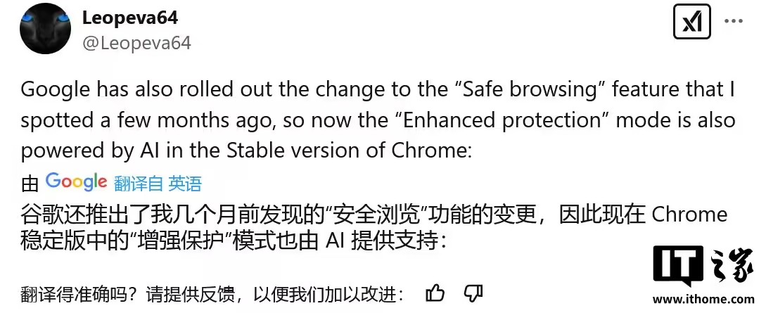 IT之家 2 月 17 日消息,消息源 @Leopeva64 昨日(2 月 16 日)在 X 平臺發布推文,稱在經過 3 個月的 Canary 頻道測試后,谷歌 Chrome 瀏覽器穩定版已全平臺上線全新“增強保護”(Enhanced protection)功能,在現有功能基礎上,通過 AI 實時防護危險網站、下載和擴展程序等。